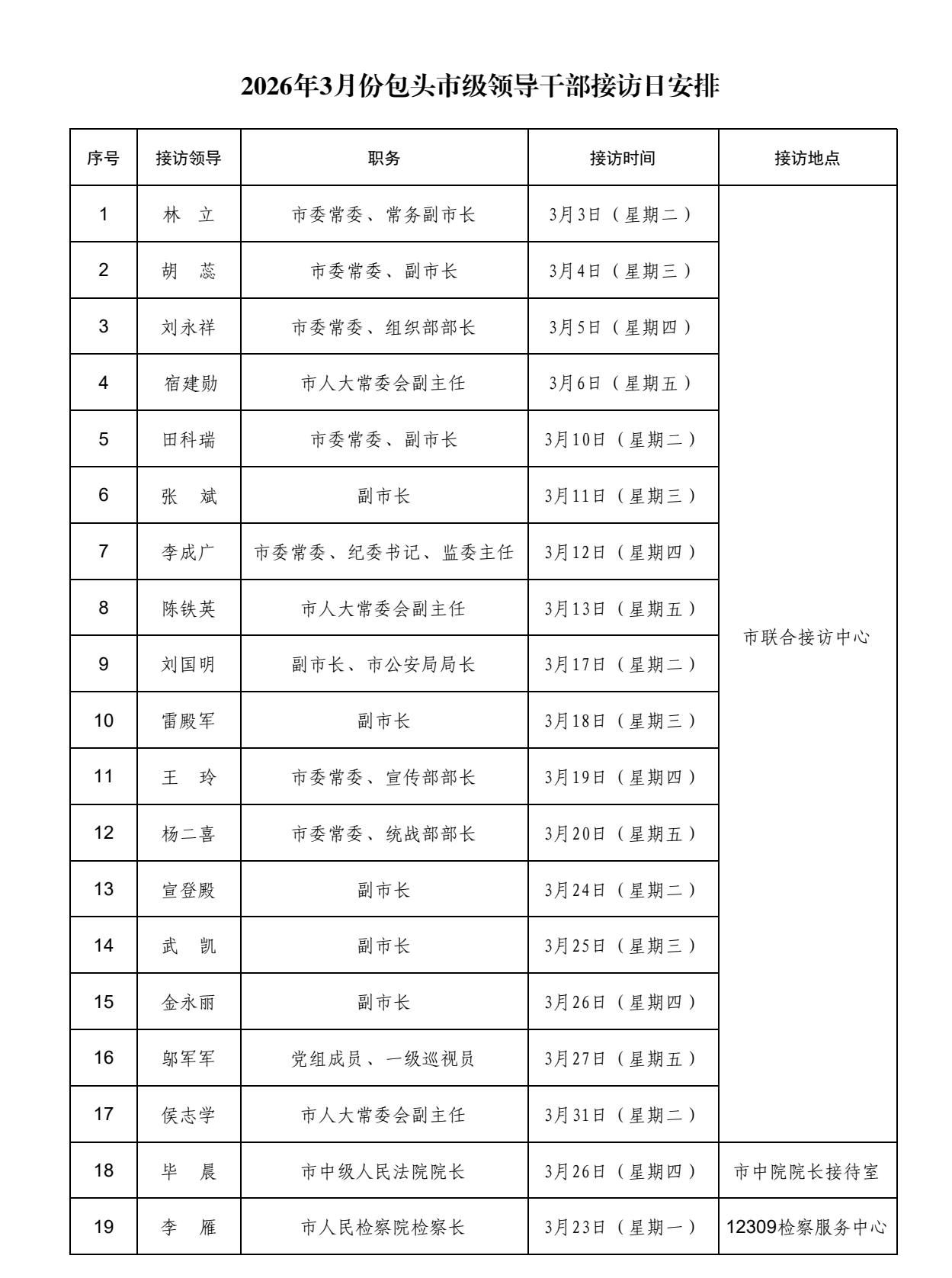 2026年3月份包头市级领导干部接访日安排