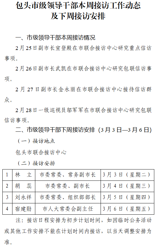包头市级领导干部本周接访工作动态及下周接访安排