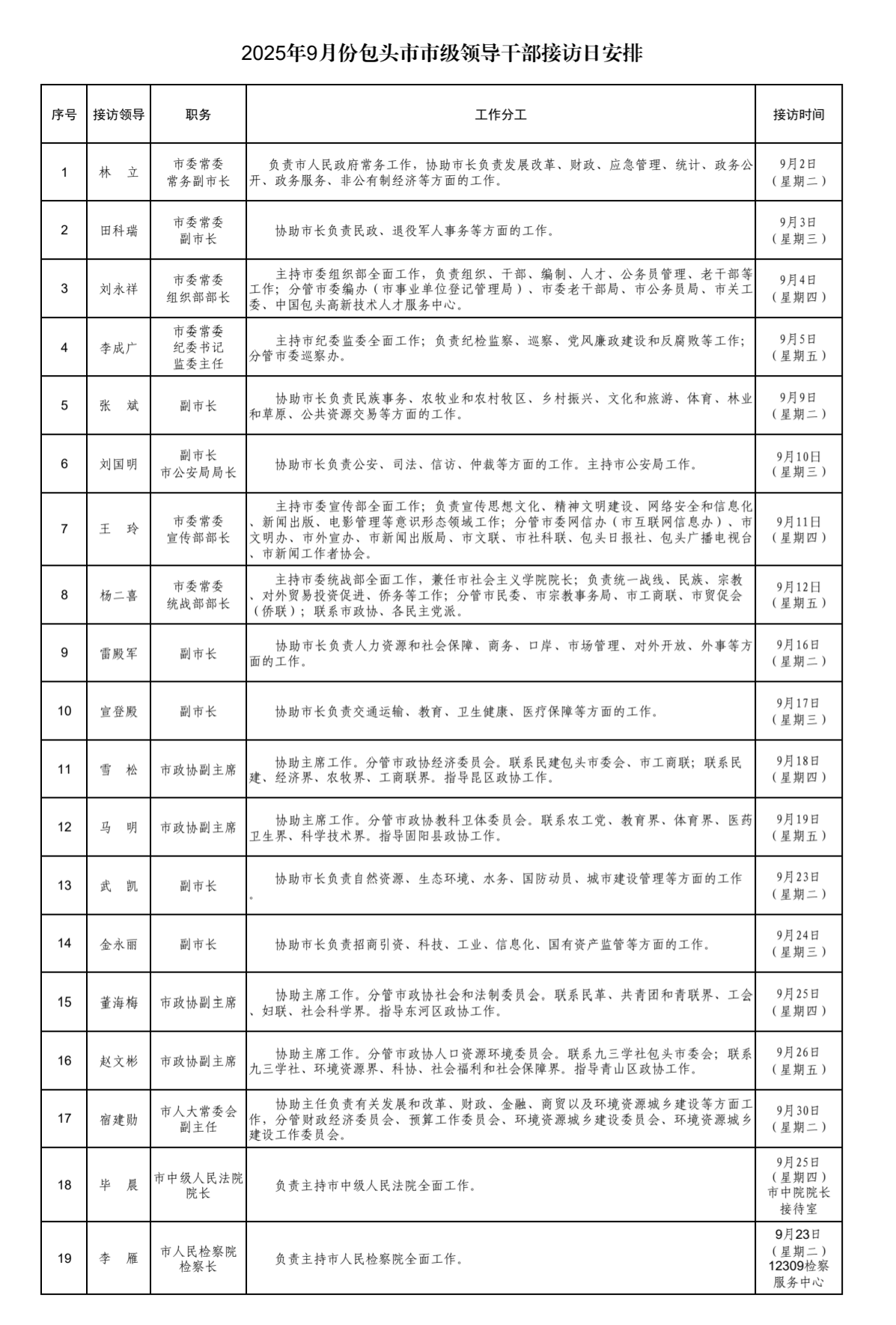 2025年9月份包头市市级领导干部接访日安排